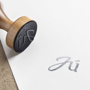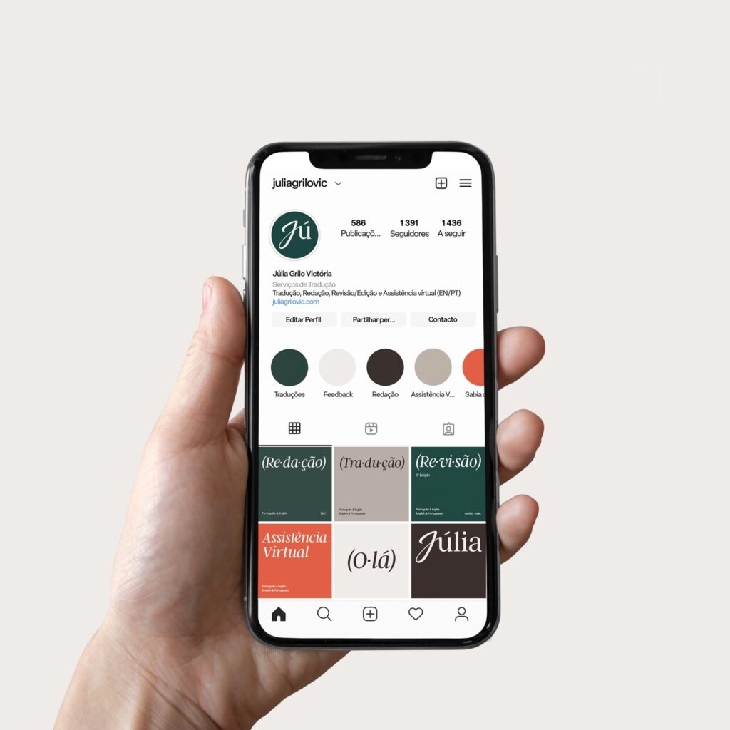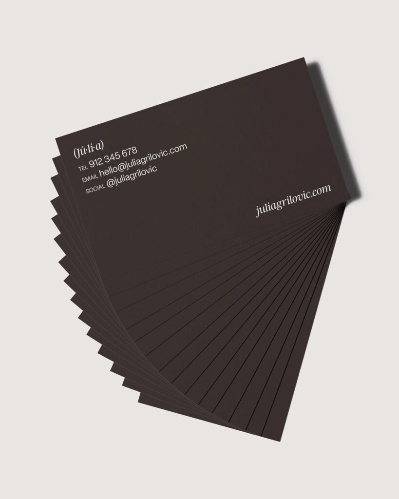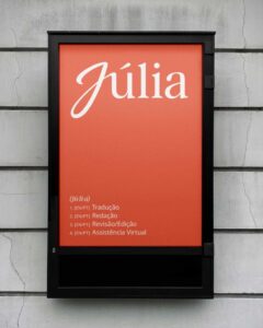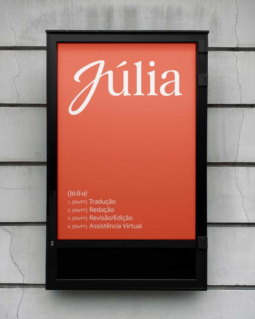 Uma junção de tipos de estilos onde as iniciais se distinguem pelo carácter caligráfico. Tudo isto vai muito além do que uma simples combinação de 2 tipos de letra, surgindo assim a incorporação de detalhes da Font serifada nas iniciais caligráficas. Criamos assim algo único à Júlia, que reflete uma personalidade profissional, com um pingo criativo.